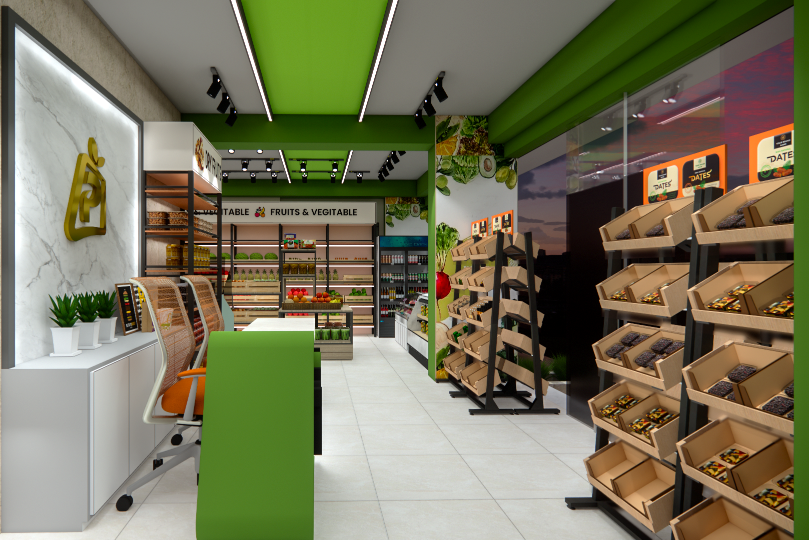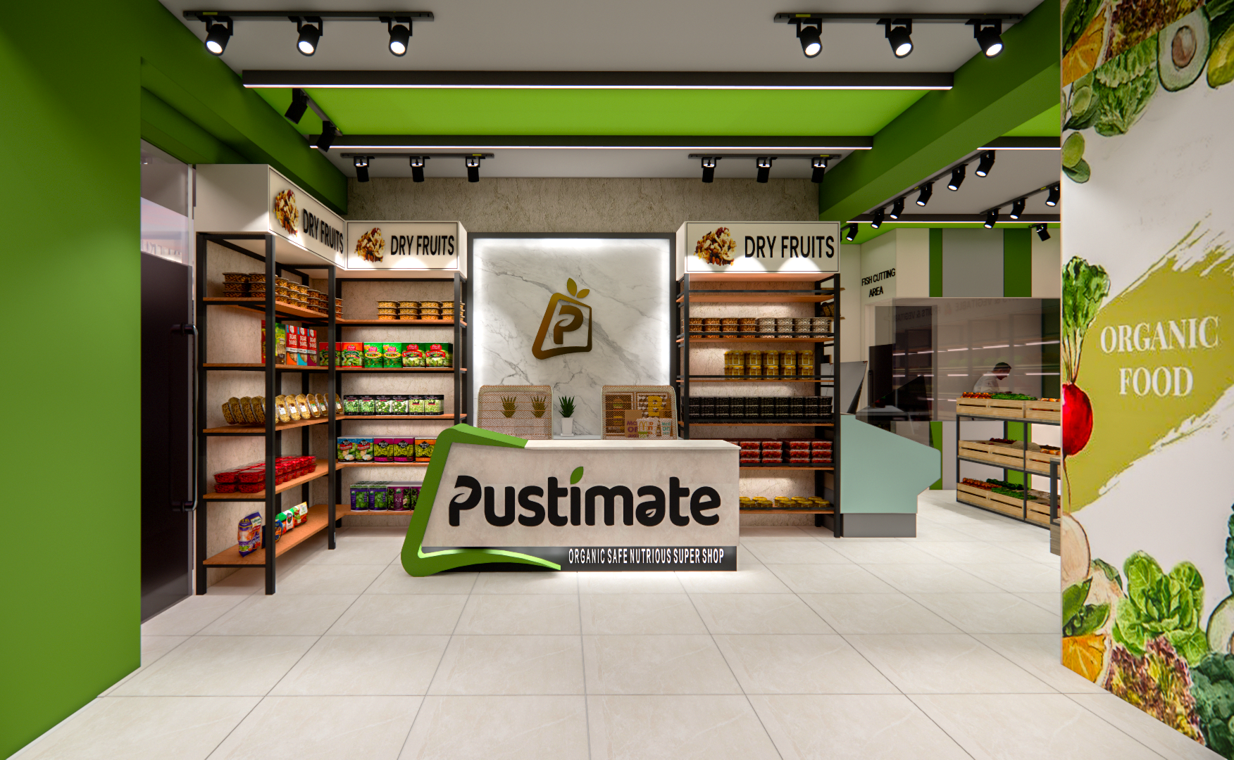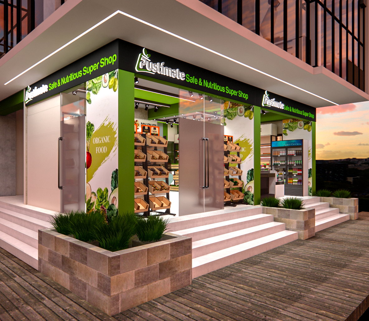 We delivered a comprehensive two-floor commercial interior design consultation for the Pustimate Store, optimizing for wellness and retail efficiency. The Ground Floor features a vibrant, customer-focused layout for an Organic Food Store, complete with natural finishes and fresh produce displays.