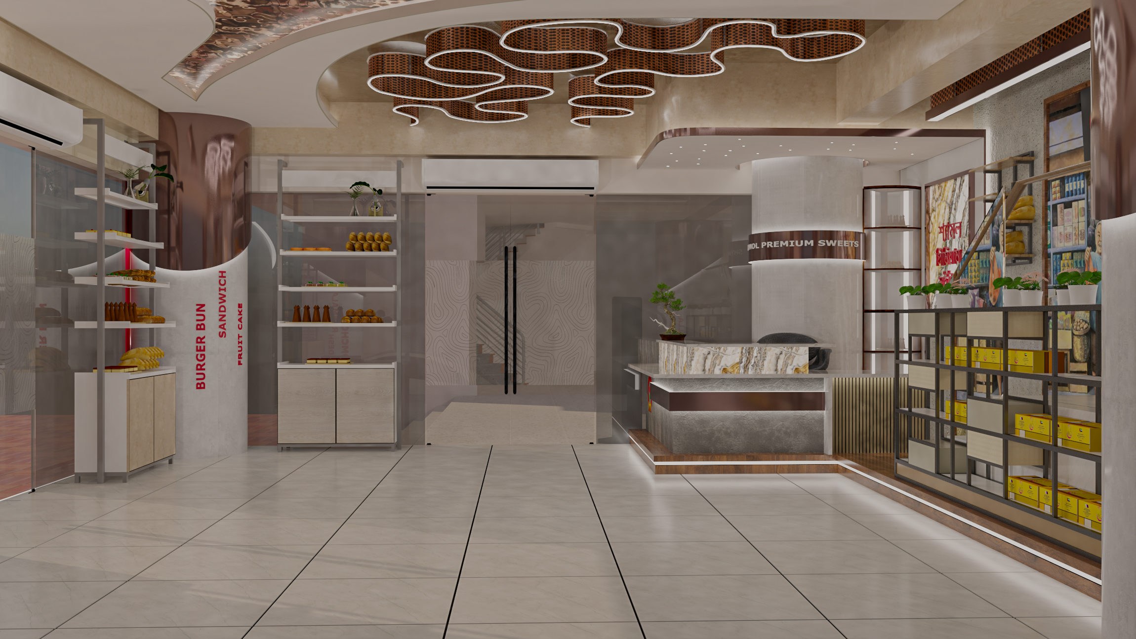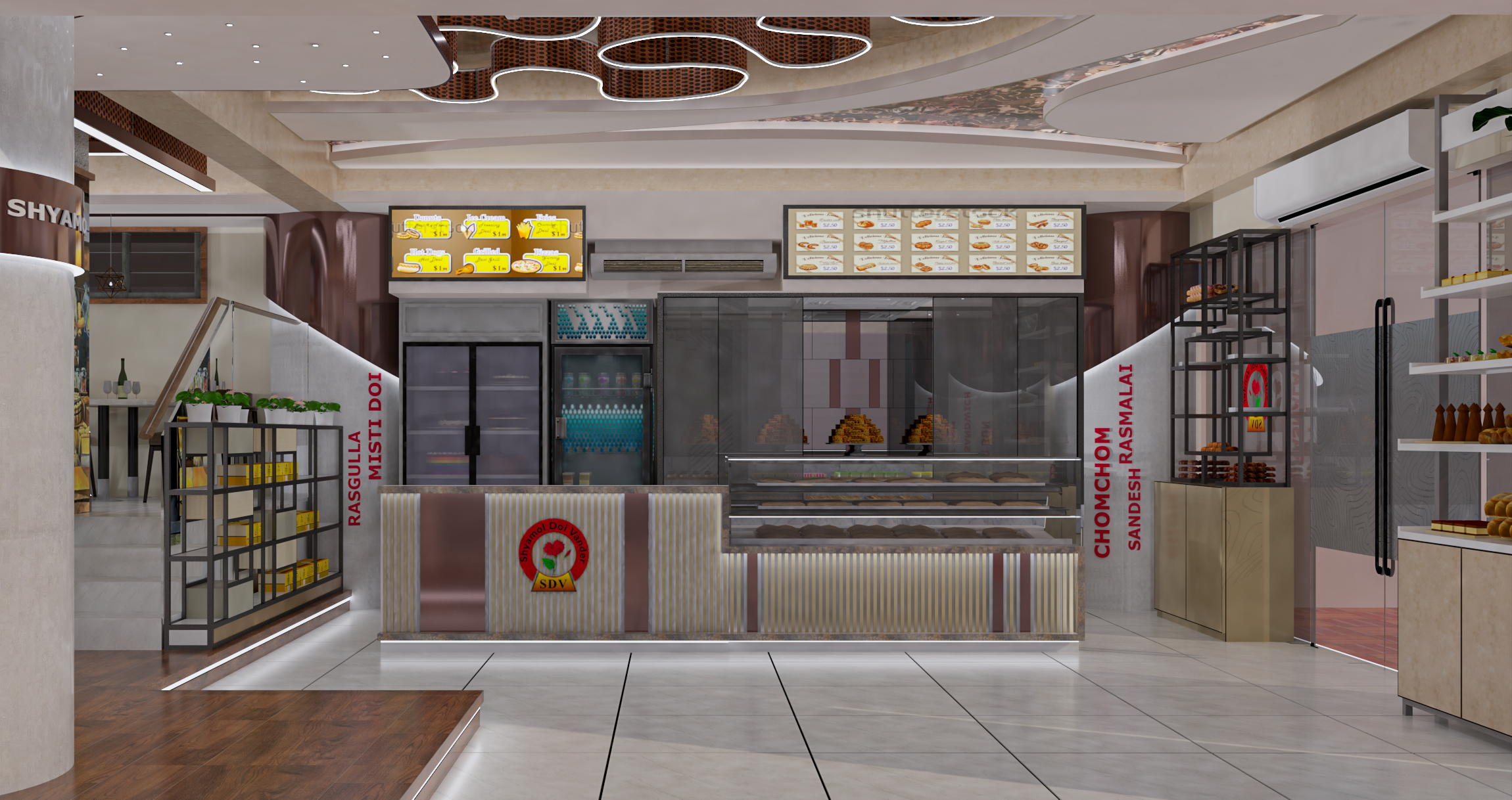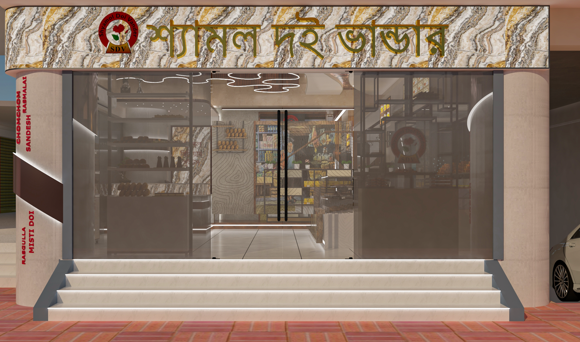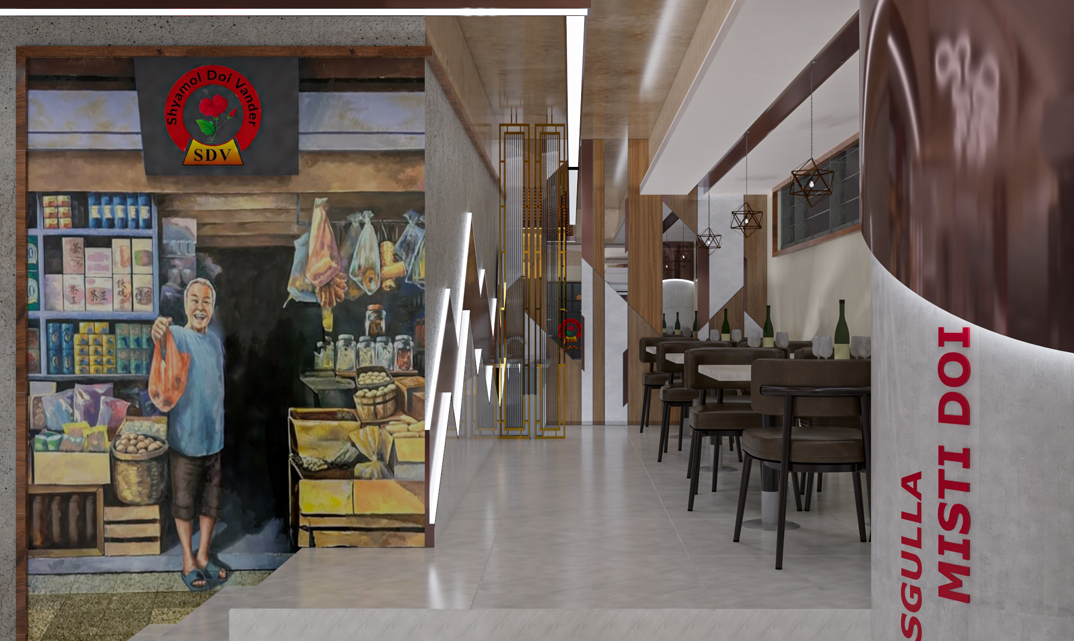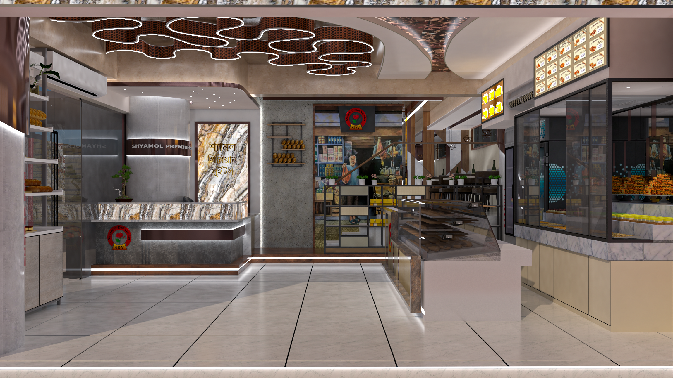 Shyamol Doi Vander is a premium retail interior project that blends traditional heritage with modern sophistication. The design features a luxurious material palette, including veined marble finishes, warm wood paneling, and sleek metallic accents.